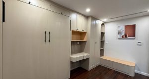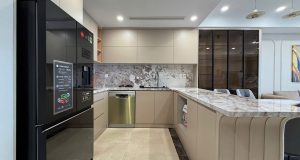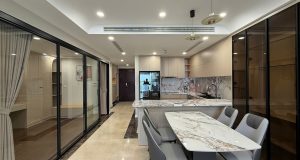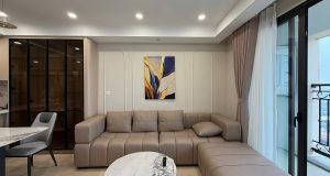 Căn hộ sử dụng gam màu ấm áp, trung tính tạo cảm giác dễ chịu. Phòng khách được bài trí hài hòa, hệ thống tủ kính giúp tăng độ mở cho không gian, gần gũi với thiên nhiên bên ngoài. Phòng ngủ chính có cửa sổ thoáng đãng, tăng cường sự kết nối với thiên nhiên bên ngoài.